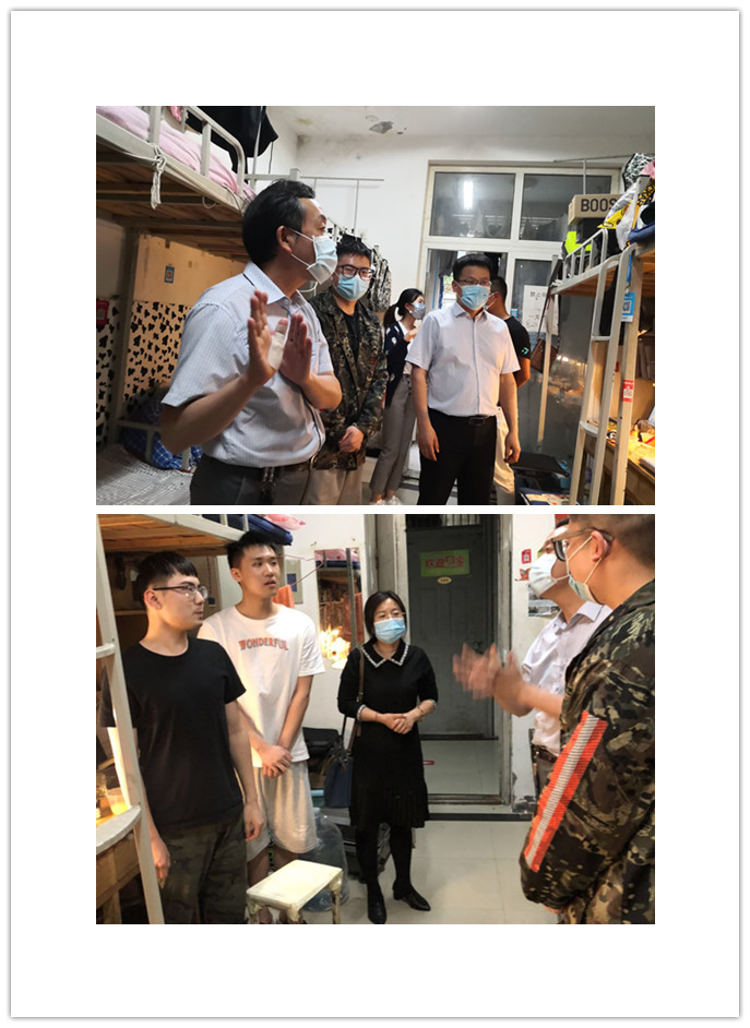 5月20日下午六点,tyc522cc太阳成集团书记胡晓波、院长魏庆葆、副院长刘士伟和副书记祝聪楠深入学生宿舍进行走访,了解我院首批返校学生的清考复习、毕业论文进展、工作、考研复试和个人生活等方面的情况,嘱咐大家要遵守学校的有关规定,做好自我防护,同时要把握好离校前的这段时间,安排好毕业论文进度,以积极的心态面对生活,预祝每一名毕业生顺利毕业。
