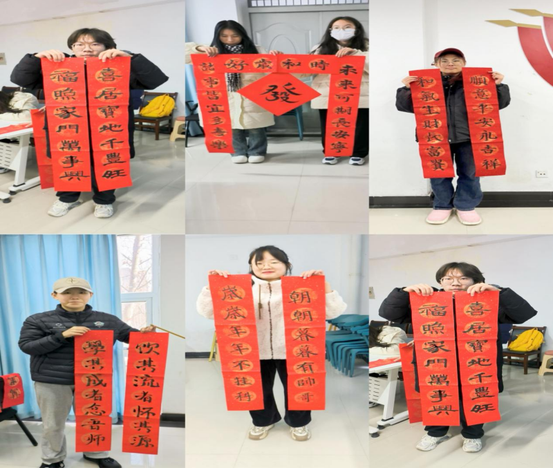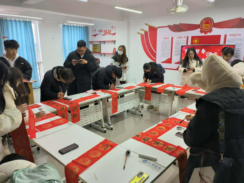 为喜迎新年的到来,弘扬中华优秀传统文化,培育学生人文素养,加强宿舍文化建设,我院于12月20日在1-2号宿舍楼连廊2206开展“岁岁望春迎元旦,笔墨飘香作对联”活动。