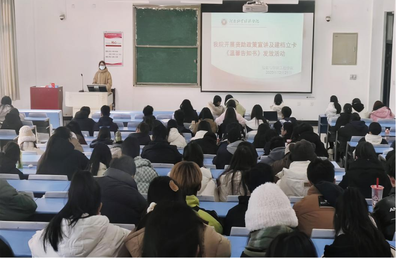 为全面落实学生资助政策,加强学生资助规范管理,大力推进精准资助和资助育人,tyc522cc太阳成集团于12月21日在教学楼合301召开资助政策宣讲会并发放《建档立卡贫困家庭学生受助情况温馨告知书》。学院全体建档立卡学生参加了会议,会议由资助专干陈梦楠老师主持。