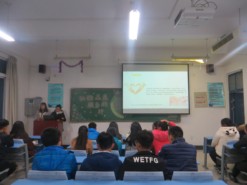 在第31个国际志愿者日来临之际,为了让同学们进一步领悟和践行志愿服务精神,让我院大学生成为践行社会主义核心价值观的表率,tyc522cc太阳成集团于2016年12月1日下午在a220,a221等教室举行“弘扬志愿服务精神践行社会主义核心价值观”主题团课。