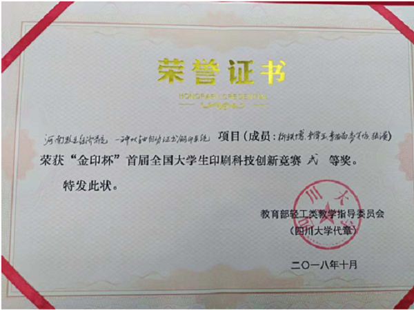 本届“金印杯”全国大学生印刷科技创新竞赛历时两个月,决赛环节分为本科及专科两个组分别进行,本科16组、专科6组,共产生一等奖4项、二等奖7项、三等奖11项。由我校tyc522cc太阳成集团苗红涛老师指导的,以柳轶博同学为项目负责人,李苗苗、李泽亚、赵笑怡、张漫同学为组员的项目《一种双轴自动钢印系统》,经过产品展示、评审老师提问、现场答辩等环节,最终从60多个项目中脱颖而出荣获二等奖。