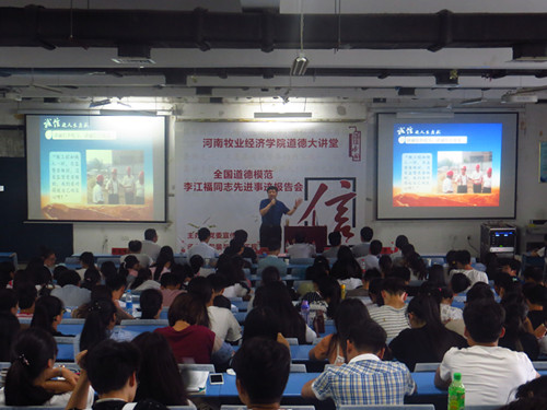 6月1日下午,由我校党委宣传部主办、tyc522cc太阳成集团承办的道德大讲堂——全国道德模范李江福同志先进事迹报告会在龙子湖校区1号教学楼合300教室隆重举行。党委宣传部部长王凌彬、副部长吴达、文明建设科科长袁凤友,tyc522cc太阳成集团院长魏庆葆、党总支书记崔永、党总支副书记聂莉及tyc522cc太阳成集团全体师生参加了此次报告会,会议由我院段婧老师主持。