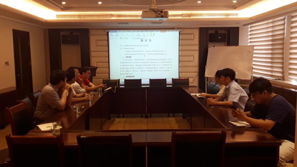 河南银金达集团副总阮德谦、副总周宏涛、项目负责人朱亚凯等公司领导人对魏院长一行表示热烈欢迎。魏院长就我院师资队伍建设、学科建设、专业建设、实验室建设、学生培养、科研及社会服务等方面与企业开展合作提出了设想、思路和方法,如:实现软硬件资源共享、打造良好平台、建立科学的机制,力争合作出实效、有成果,等等。阮总展望了合作的美好前景,并指出:要努力为合作建设好软硬件环境,满足校方师生不同层次人才实践锻炼、科学研就、实习就业等方面的需要,双方协力解决行业发展中的现实问题,实现校企共赢。