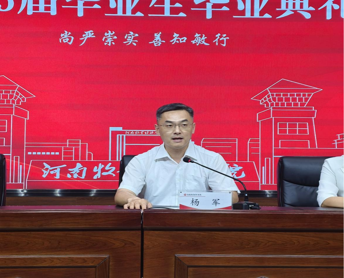 典礼最后,学院党委书记杨军发表总结讲话。他向即将奔赴人生新征程的毕业生表示热烈祝贺,并寄语四点希望:一是要厚植家国情怀,将个人理想融入民族复兴伟业,在强国建设中建功立业;二是要常怀仁爱之心,涵养道德品格,做温润有度、正直善良的人;三是要坚守学习之志,持续精进,终身学习、终身成长;四是要砥砺奋斗精神,于风浪中不惧艰难,于挑战中不改初心。