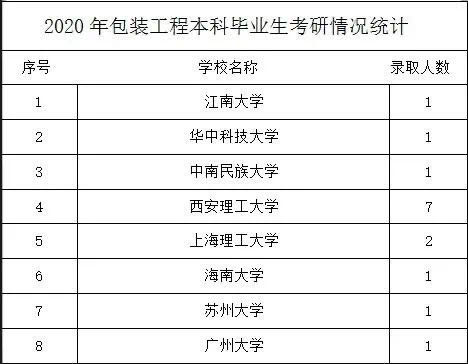 包装工程专业学生基础理论扎实,就业或者深造后劲儿足。考研报考率、录取率双高,连续两届录取率均在25%左右,录取质量连年提升,部分学生被华中科技大学、江南大学、苏州大学、海南大学、河北工业大学、湖南工业大学、天津科技大学、西安理工大学等985、211及业内知名院校录取。