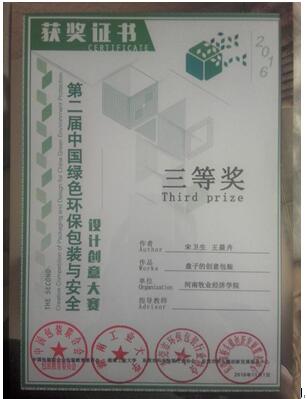 在2016年第二届“中国绿色环保包装与安全设计大赛”活动中,收到来自全国22个省136家企业高校报送作品共计2663份。我院教师宋卫生指导王晨卉等三名学生参与了此次大赛的作品设计申报。经过大赛组委会专家严格评审,最终评出95件获奖作品,其中一等奖作品4件,二等奖作品10件,三等奖作品26件,优秀作品55件,我院师生参赛作品“盘子的创意包装”喜获大赛三等奖。