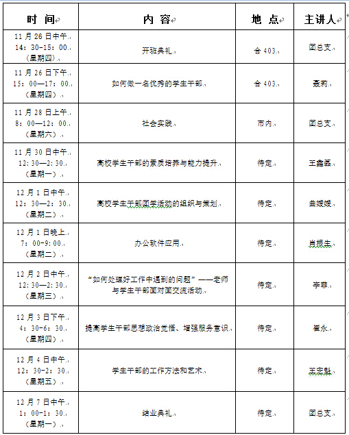 “青马工程”大学生骨干培训班授课时间及内容安排